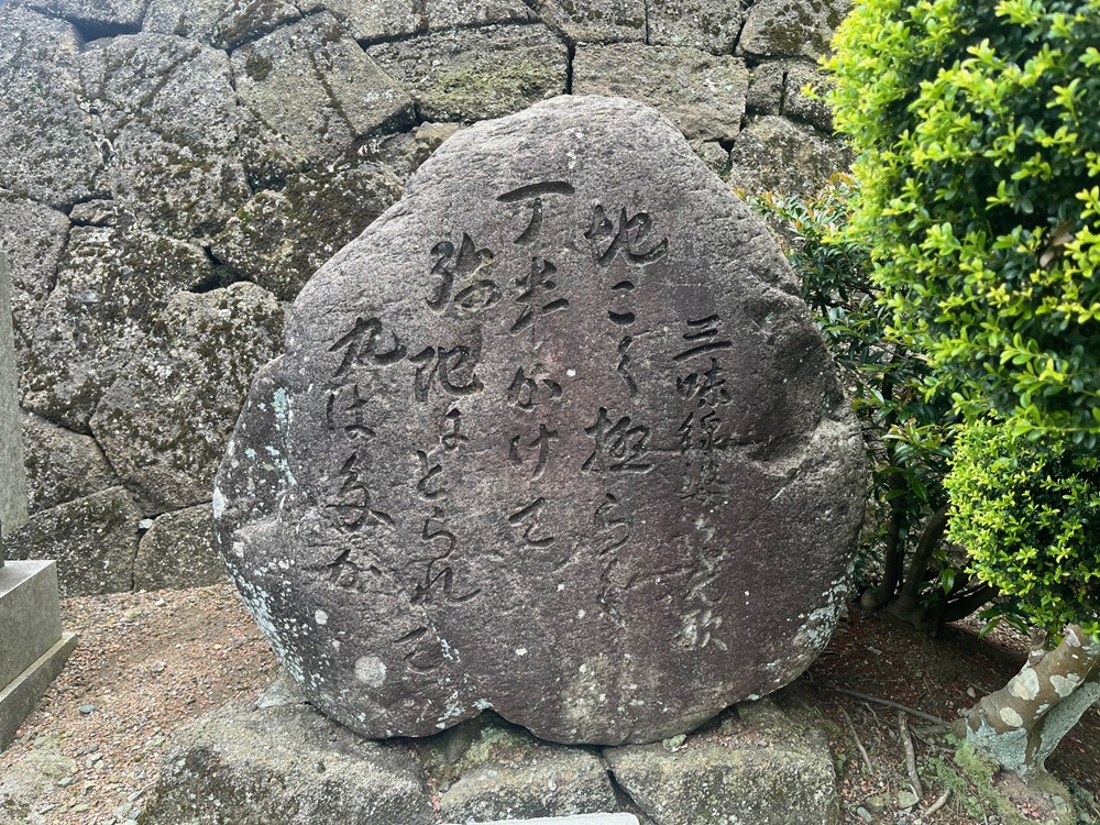 吉崎別院の境内には、三味線婆ちゃん=岡部つね(本名:はる)・明治23(1890)年石川県内灘町室に生まれる 昭和47(1972)年1月6日82歳にて西帰=の句碑が建立されている。