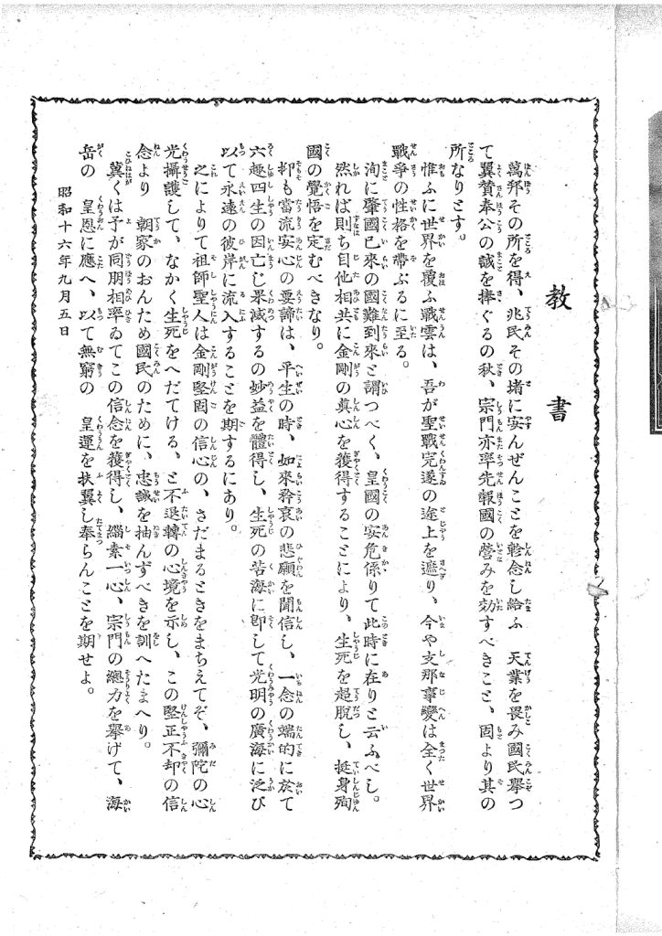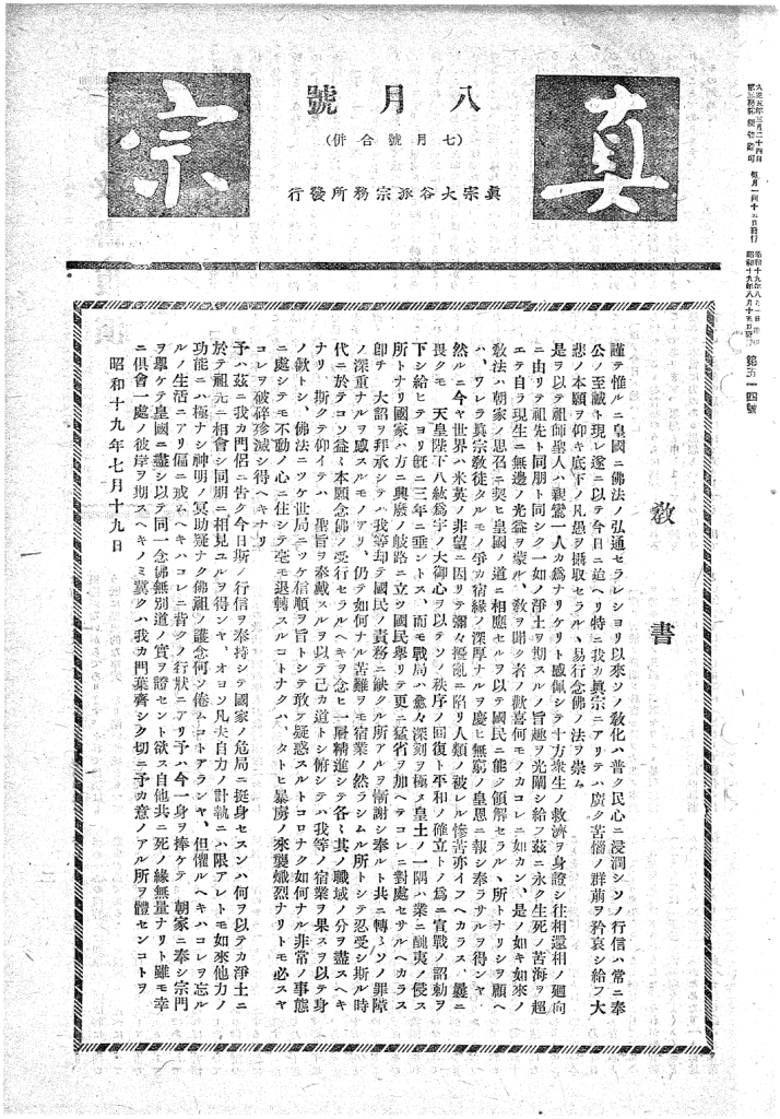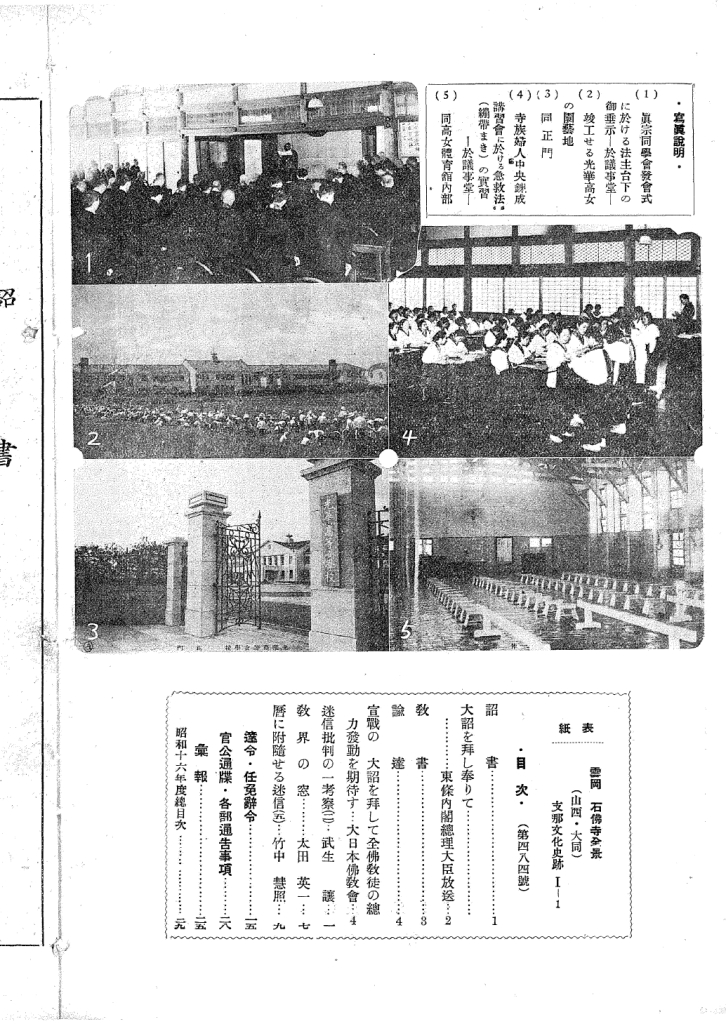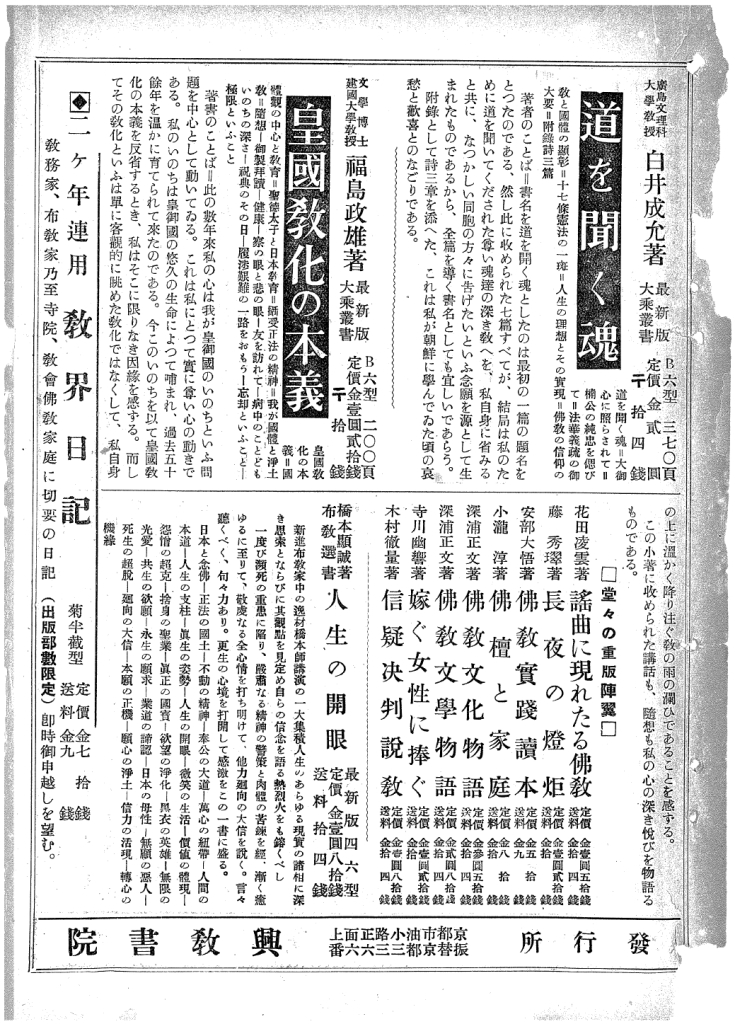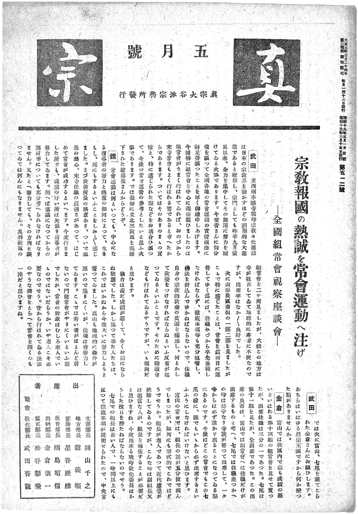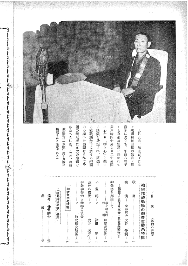 尚、『真宗』誌巻末の書籍広告には、武内了温師『大政翼賛と浄土真宗』、豅教化研究院長『みくにとともに』、大河内了悟師『敬神崇仏』といった書名がみえます。ほんの一例ですが、一部の僧侶や教学者の問題ではないのです。視点を変えれば、教団護持の為に宗派を挙げて国家政策に順応したのは、生き延びるための知恵とも言えます。