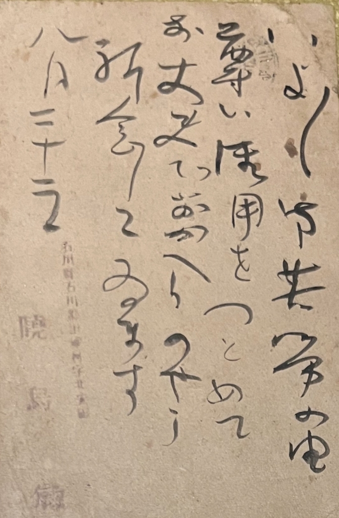 暁烏先生は和田稠(わだしげし)師が出征される際には以下の葉書を送っておられ、和田師は額装して終生大事にされていたそうです。(現在は真宗大谷派東北教区念通寺衆徒鈴木君代氏所蔵)