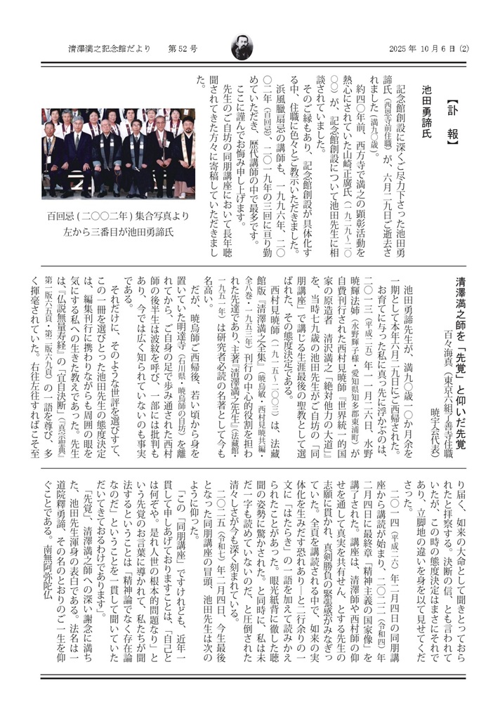 『清澤満之記念館だより』―池田勇諦師追弔文