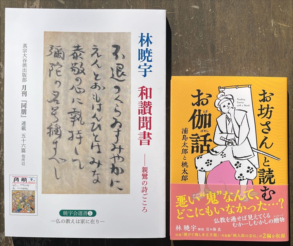 自主刊行した『林暁宇和讃聞書‐親鸞の詩(うた)ごころ』(画像㊧・A5判181頁・700円)は、暁宇会にて頒布しています。 こちらもすでに500冊余りが世に出ました。