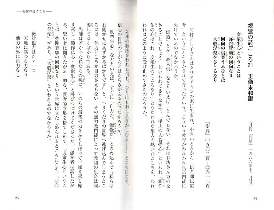 月刊『同朋』誌「親鸞の詩(うた)ごころ」欄に長期連載された短篇56篇に加え、『同朋新聞』『同朋』誌に寄稿した5篇を付録した一冊です。輪読会や同朋会のテキストとしてもお薦めしますし、拙寺でも定例法座「和讃に聞く」のテキストにします。