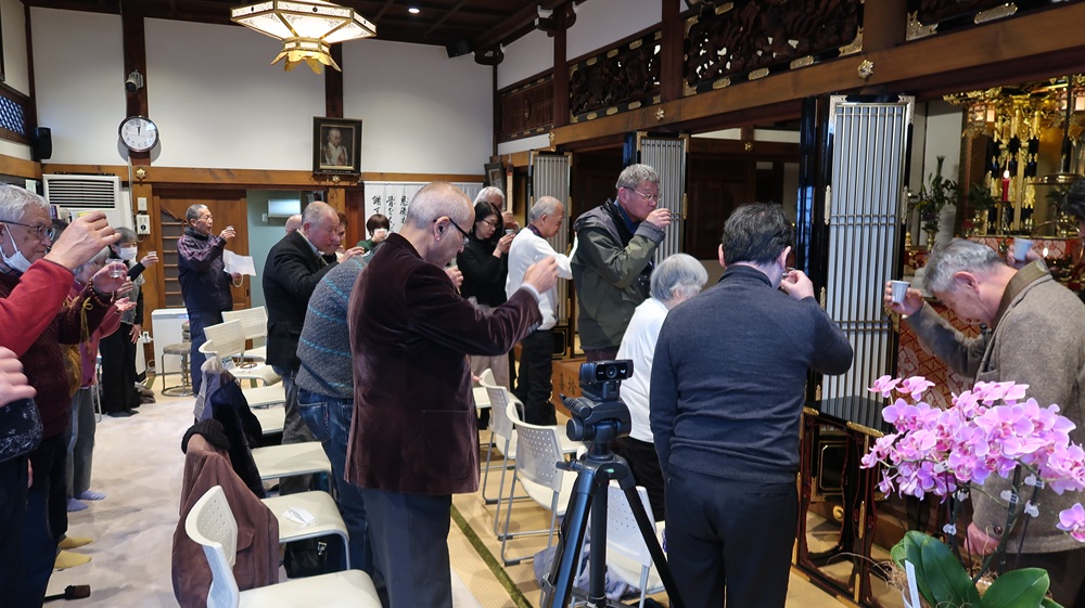 お勤め・年頭法話・献杯 客間にてお斎