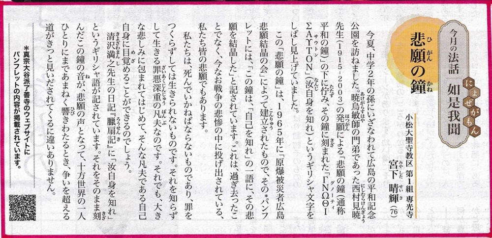 前教学研究所長・大谷大学名誉教授の宮下晴輝氏ご寄稿の『同朋新聞』11月号巻頭言にて、西村見暁師の「悲願の鐘」が紹介されています。西村師ご製作のパンフレットを掲載しているウェブページをあらためてご味読ください。